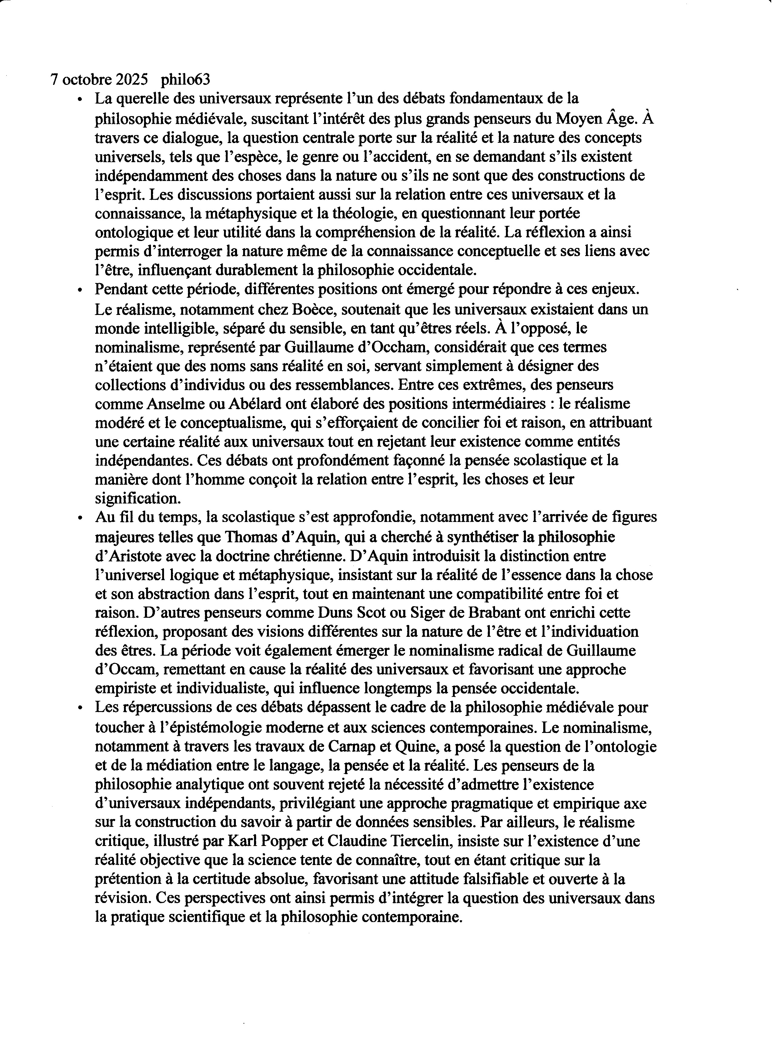 Elle concerne le mode d'existence des idées générales ou "universaux . Par "universaux" on entend des termes qui s'appliquent à plusieurs individus comme "l'Homme", "le Triangle" ou "la Justice"..... Cette Querelle est lancée dans le monde latin par un passage de l'Isagoge de Porphyre de Tyr (IIIe siècle), dans son introduction aux Catégories d'Aristote. Il pose la question sans y répondre : les universaux sont-ils séparés des choses sensibles ou existent-ils en elles ? Pour le réalisme, l'universel existe (in re ), comme une nature commune partagée par les individus d'une même espèce. L'esprit humain l'extrait par abstraction pour en faire un concept (post rem). À l'opposé du réalisme, le nominalisme soutient que seuls les individus existent. Les concepts généraux ne sont que des étiquettes, des noms (nomina), des émissions de voix (flatus vocis) : il n'y a rien de commun dans la réalité entre les individus, si ce n'est qu'on leur applique le même mot. Le terme universel est alors un signe mental qui peut se substituer dans une proposition à une multitude d'individus.